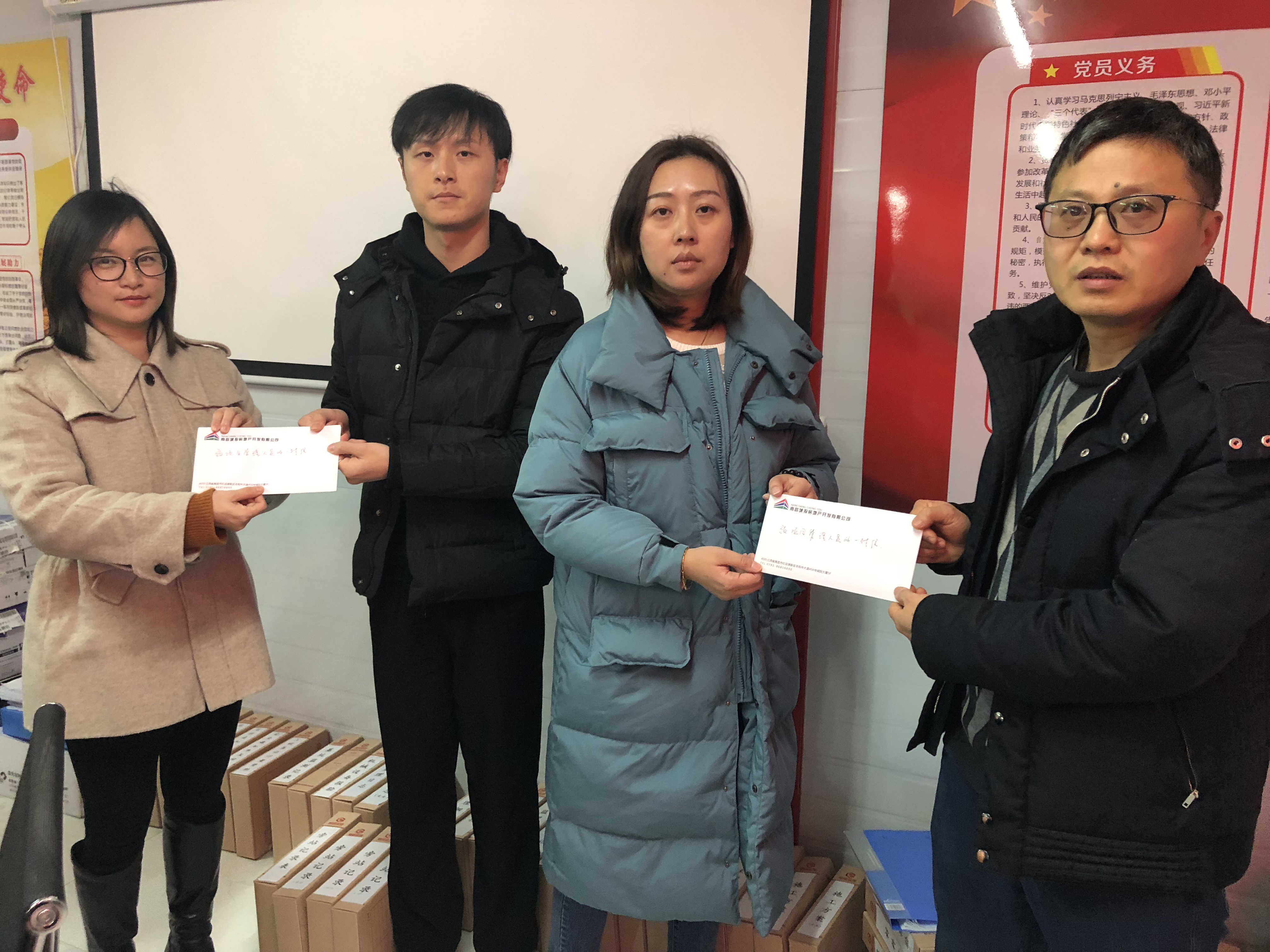 “政廉风正民心顺,纪肃法明万象新”。新春佳节到来之际,为强化南昌城投房地产公司清廉文化建设,营造崇廉尚俭的节日气氛,助力南昌市中心城区棚户区刷新项目清廉高效的推进,城投房地产公司监察室深入棚改项目一线,向全体棚改项目管理职员发放《致公司项目管理职员的一封信》,共计25份。